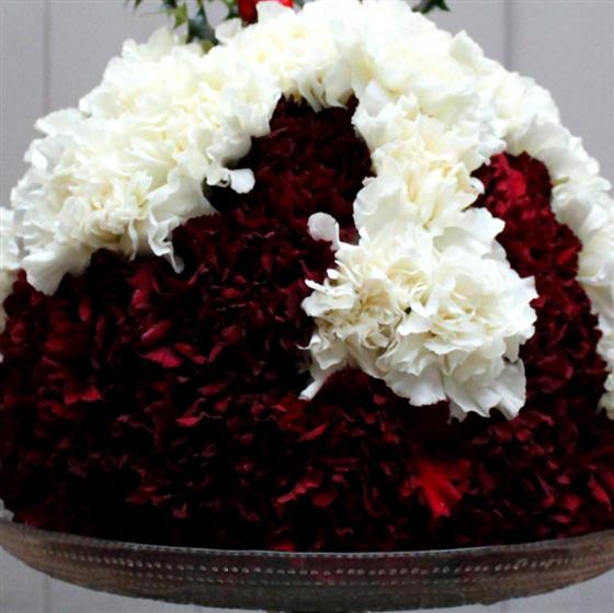 This clever arrangement is a fun and festive addition to your Christmas table. Pretty clove and white carnations on a glass cake stand are arranged to create a floral Christmas pudding that will delight your friends and family.