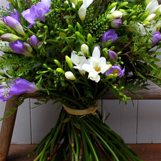 A hand tied bouquet of beautifully scented mixed freesia and seasonal foliage