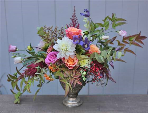 A stunning arrangement created using a selection of seasonal blooms presented in a Hogarth Curve style.