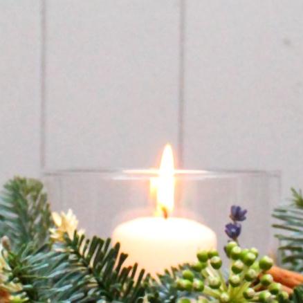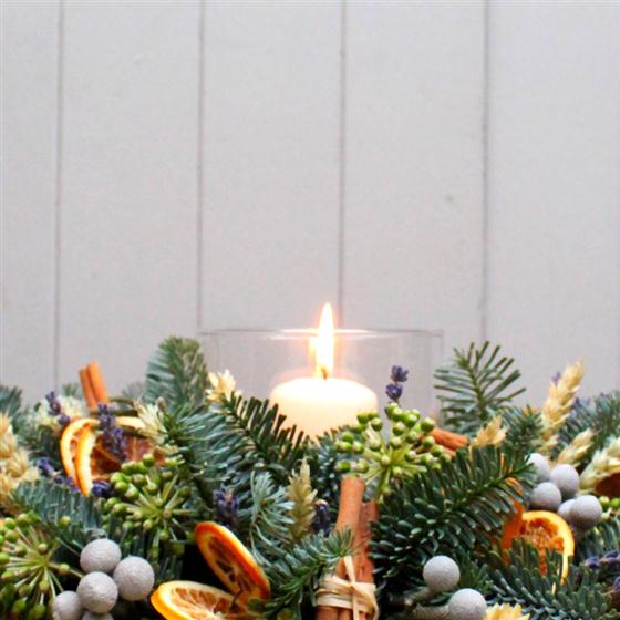 This elegant arrangement circling a candle in a vase, made with kotchia, noble pine, dried orange slices, wheat, lavender, cinnamon and cones makes a traditional centrepiece for your Christmas table.